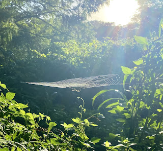 明け方に少し雨が降ったのでしょうか、今朝の緑地はいつもより涼しく、葉っぱがツヤツヤに濡れて、大きな木からポタポタとしずくが垂れて朝陽にキラキラ輝いていました。濡れて浮かび上がったクモの巣のアートも美しかったです♪
